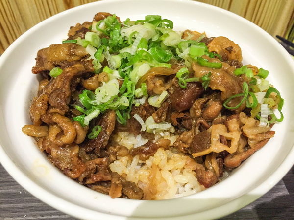 大量的燒肉跟蔥花豪邁地舖疊在白飯上,光是肉疊起來的高度大概就有三公分,肉控來應該可以吃得很爽。