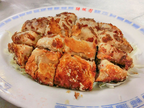 當店招牌,外層為裹粉油炸的酥皮,中層為厚實鬆軟的芋泥,下層則為帶點彈性具嚼勁的鴨肉,