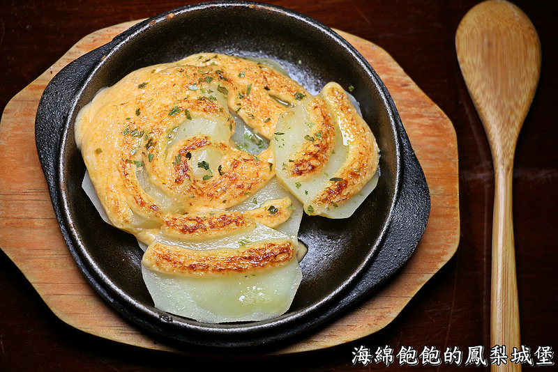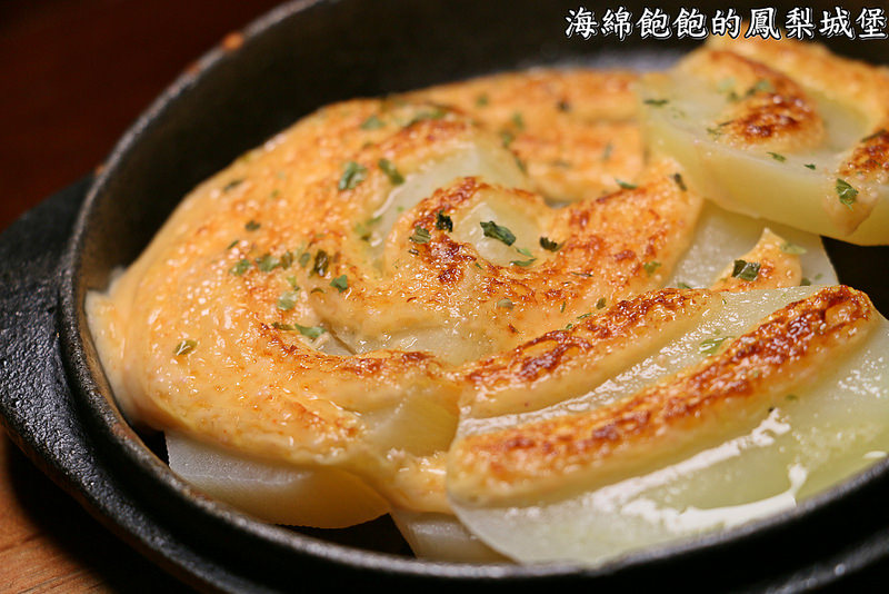 馬鈴薯切成厚片狀,再加上明太子醬炙燒