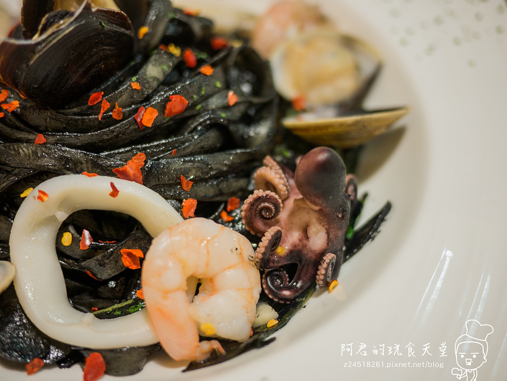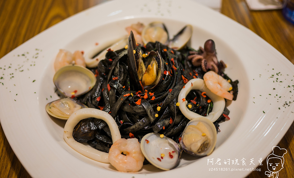 ▼烏蘇拉總匯海鮮細扁麵$310,用料很豐富,汁收的很乾,非常入味,帶點微辣。