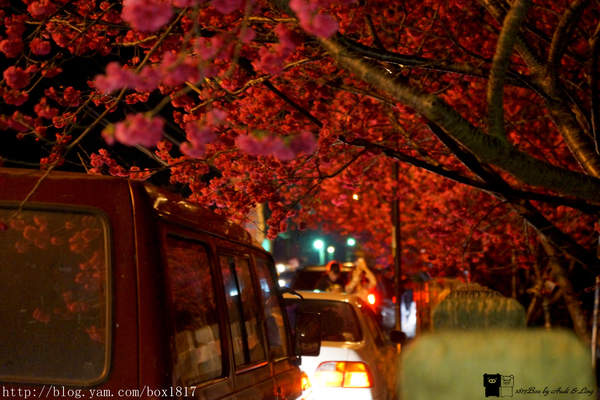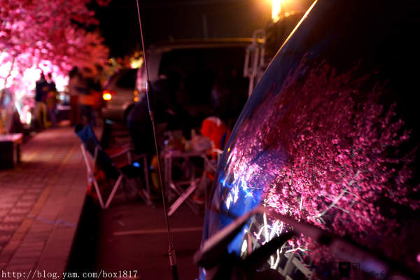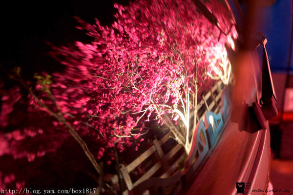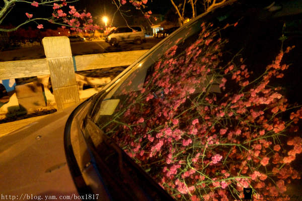 雖然是夜晚,但櫻花反射在車玻璃前的身影也婀娜多姿,