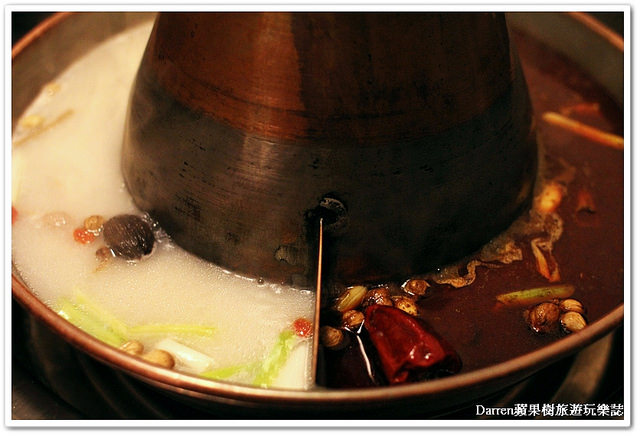 點好兩種湯頭,煙囪紫銅鴛鴦鍋上桌囉!!!我點了原味豚骨及川味麻辣兩種鍋底