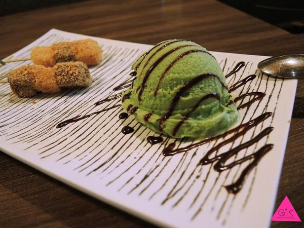 抹茶冰淇淋加上撒上花生粉的麻糬