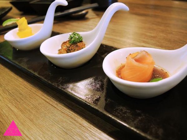 開胃菜由近到遠分別為黑鮪魚捲 黑胡椒杏鮑菇 醋汁南瓜