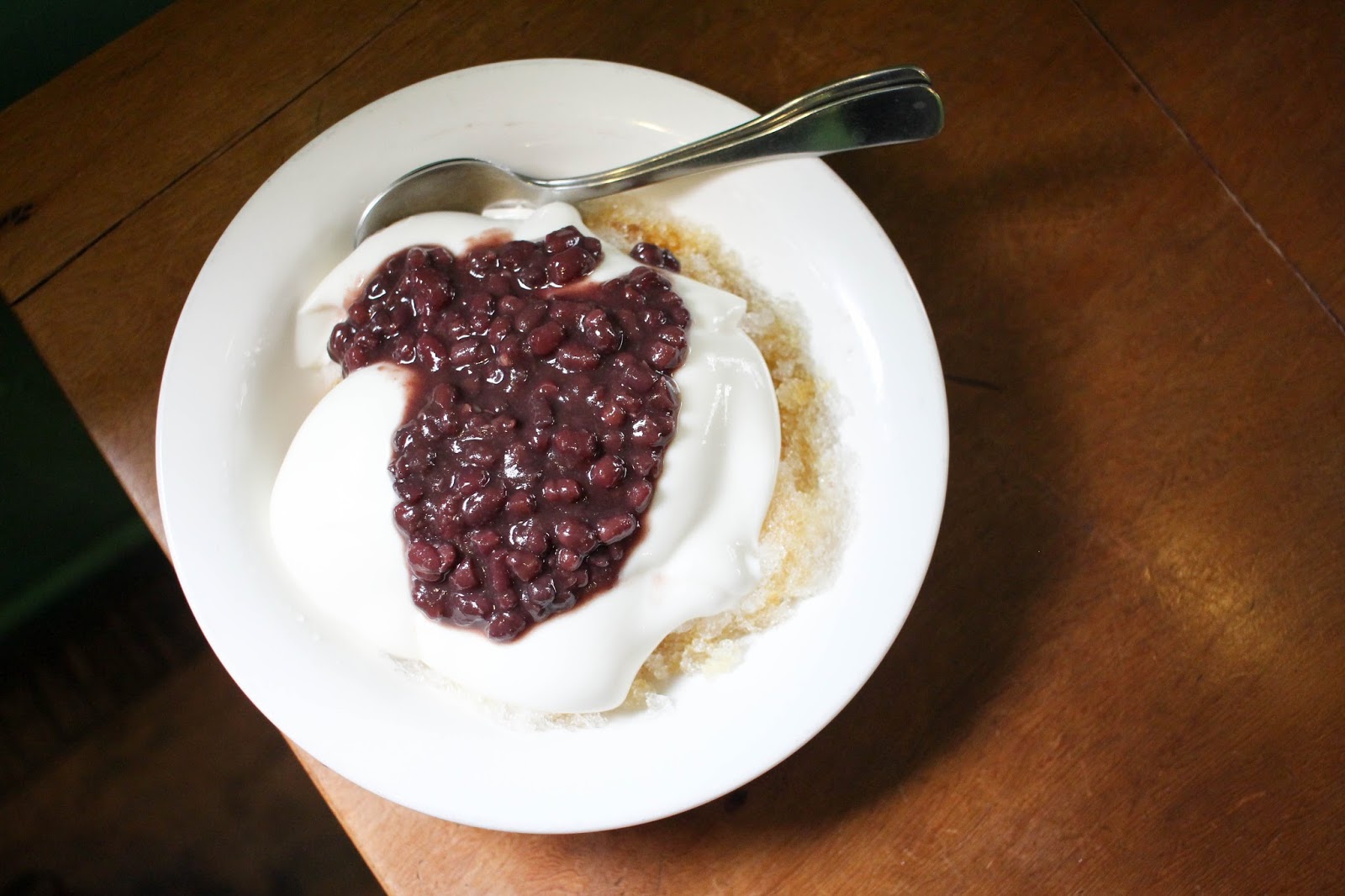 底層舖著一層滿滿的冰整體的份量滿大的,放上杏仁豆腐再以紅豆點綴其中。