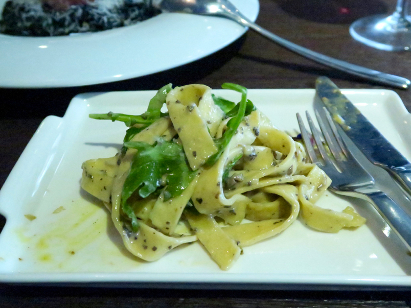 店家自製的義大利手工寬麵,桌邊服務的現場刨絲撒上大量的起司,再一次驚艷,有趣好玩,松露、松露油與cheese絲很快地在朋友攪拌中融在義大利麵裡,吃起來的口感,怎麼說,就好吃!滑潤中帶有咬勁的義大利麵~手工的就是不一樣,好吃!一樣的在三個人分食下,吃光光!
