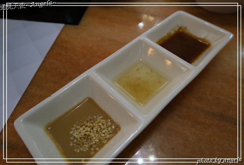 蒸煮鍋沾醬,白芝麻是服務生現磨後再放入的。依序提供的是胡麻醬、檸檬醬汁與和風醬。