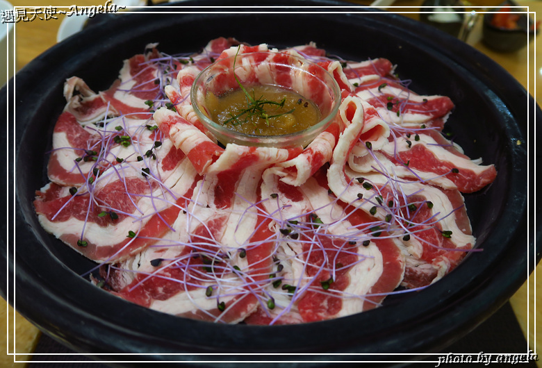 4人一桌有2個鍋,所以一鍋蒸牛肉,另一鍋同時蒸煮海鮮拼盤,上圖這個是牛肉佐紫高麗菜苗。