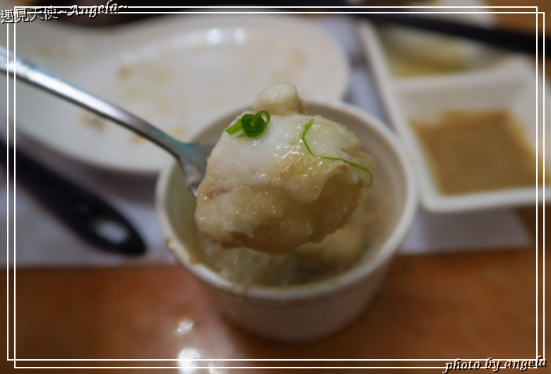 這些海鮮內容物分別是,龍膽石斑饅頭,所謂的饅頭是指台灣加日本山藥打泥製成的山藥泥。裡面除了龍膽石斑彈牙的魚肉外,還有九孔的肉質也很鮮。唯獨這個獨特的山藥泥醬汁,味道有點偏甜,我比較不愛。