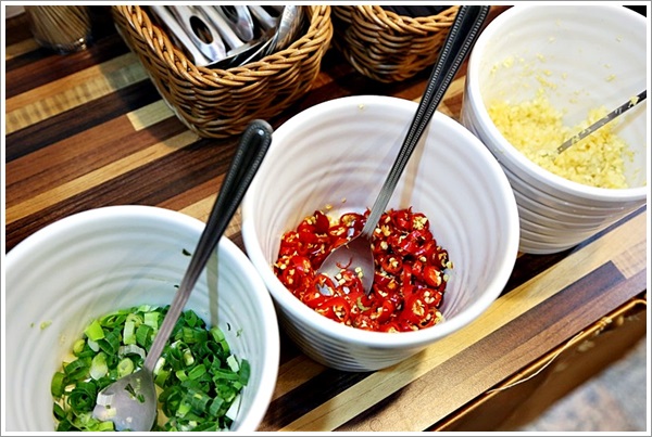 | | 店裡除了自製的沙茶醬外也有青蔥、蒜、辣椒… momo我習慣每種都來上一點… 一整個就是吃很重口味的人,哇哈哈哈… |