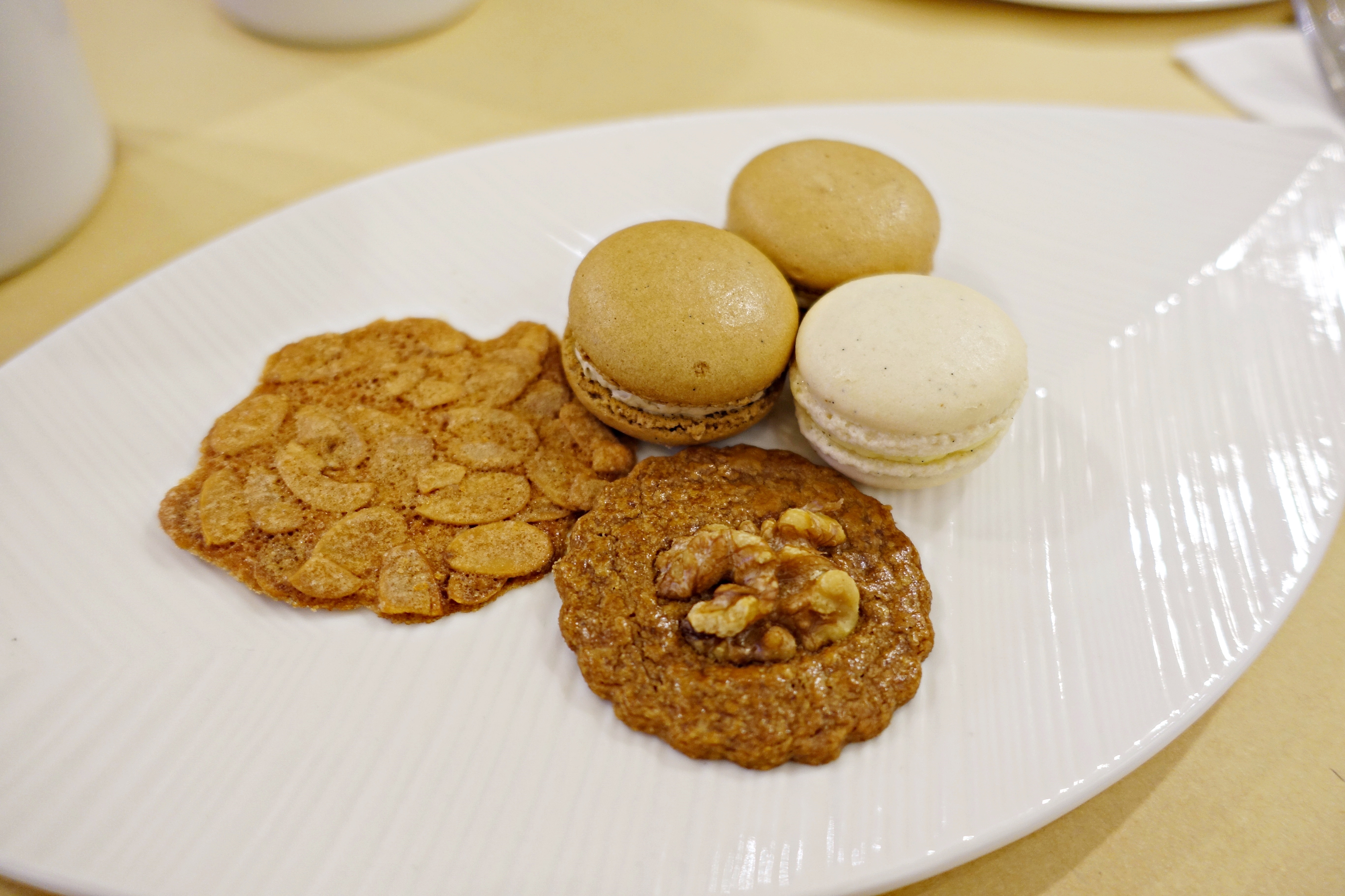 綜合小餅乾內含杏仁餅(左)、胡桃餅(右)與馬卡龍。杏仁餅吃起來脆脆的,淡淡的杏仁味中帶點微甜;胡桃餅則是有種吃堅果類的感覺,兩款餅乾味道還可以。