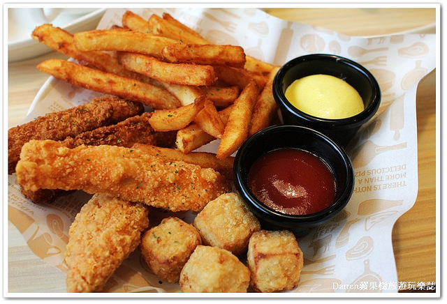 吃完聊天嘴饞我們點了拼盤來分食▲搖滾派對拼盤(薯條+雞柳+魚條+骰子雞) NT:128