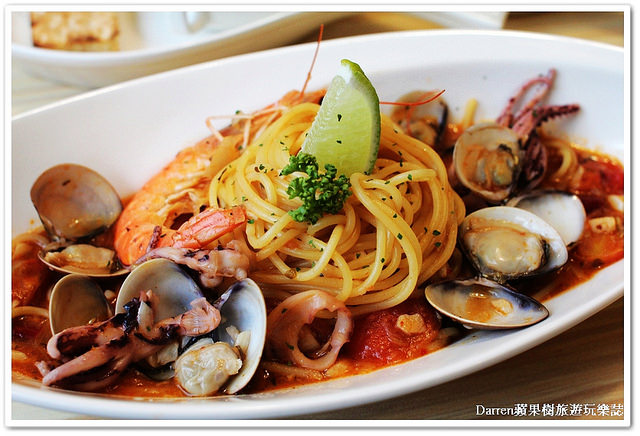 這道泰式海鮮義大利上面有檸檬建議一定要擠下去然後拌勻比較夠味,微酸的滋味配海鮮剛好