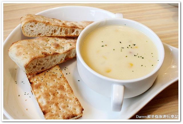 趁熱吃麵包外脆口感很好,還可以沾巧達玉米濃湯帶點奶油香氣也不錯