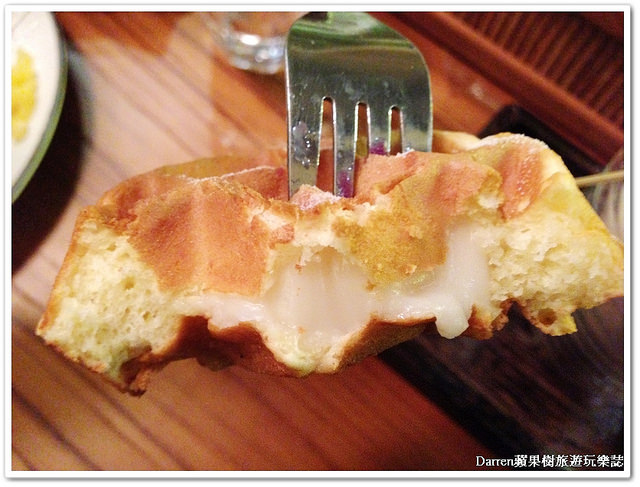 鬆餅咬下去裡頭有麻糬超級軟Q會牽絲很好吃,搭配紫薯超級讚的啦,整個超愛這鬆餅