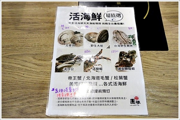 | | 團緣的海鮮真的是個會讓我超失控的也方… 看這上面有北寄貝、野生大蛤、野生鮑魚、大沙公、活龍蝦等… 吼~~~~這根本就是要逼死我來著的呀!!!… 來人呀~~~還不快給我全都上上來XDDDD… |