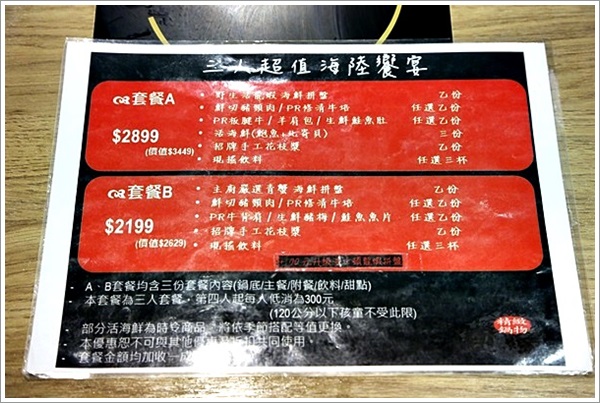 | | 看完環境後就準備來點餐啦!… 我們今天就是衝著海鮮來的,所以海鮮肯定要給它點個夠… 二話不說當然是點了2899元的A套餐… but只有點這些就不是我們的風格了,其它單點當然也都要給它來一下的阿… |