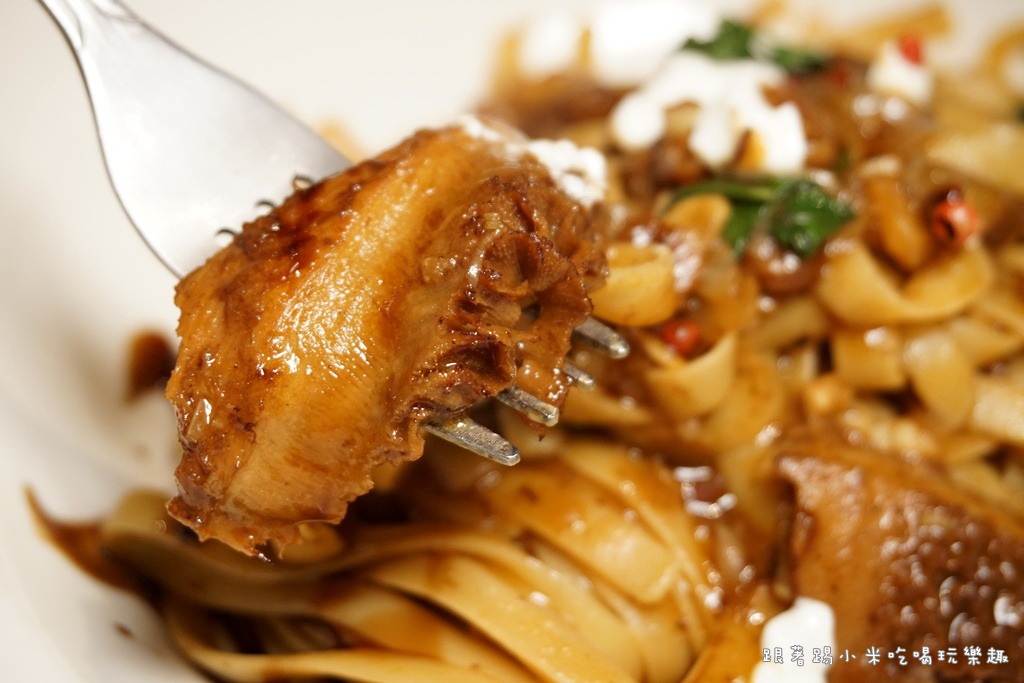 寬扁麵是帶點嚼勁麵條, 不會有軟趴趴口感, 吸了醬汁很好吃~ 酒醋酸香另一個作用是吃多也不會有油膩感, 這一道麵食小米很推薦唷