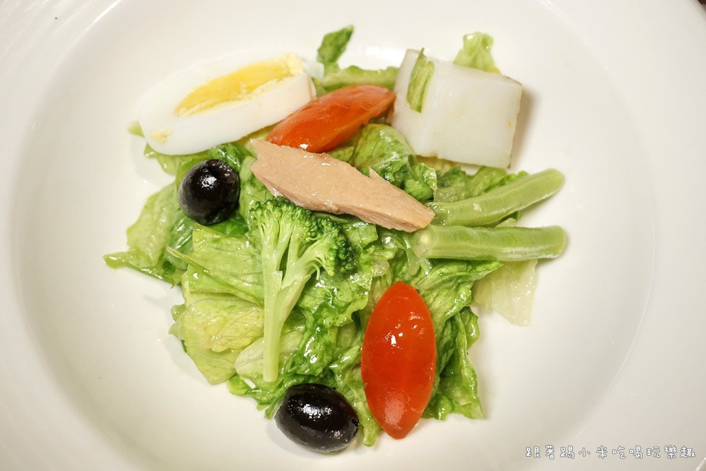 沙拉有凱撒及尼斯兩種口味, 沙拉看得出來不是隨便弄弄的, 使用的是較高價蘿蔓生菜, 不是普通生菜唷, 上面還灑上起司及凱撒沙拉醬~