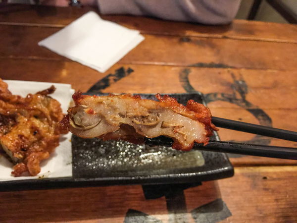 串成一長串的雞皮與別不同非常有特色,但口感既非酥脆也非肥嫩而像是在咬塑膠殼,眼睛矇起來的話