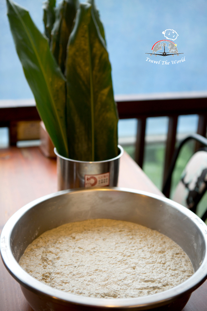 在皮的外層塗上一點油後放在粿葉上!