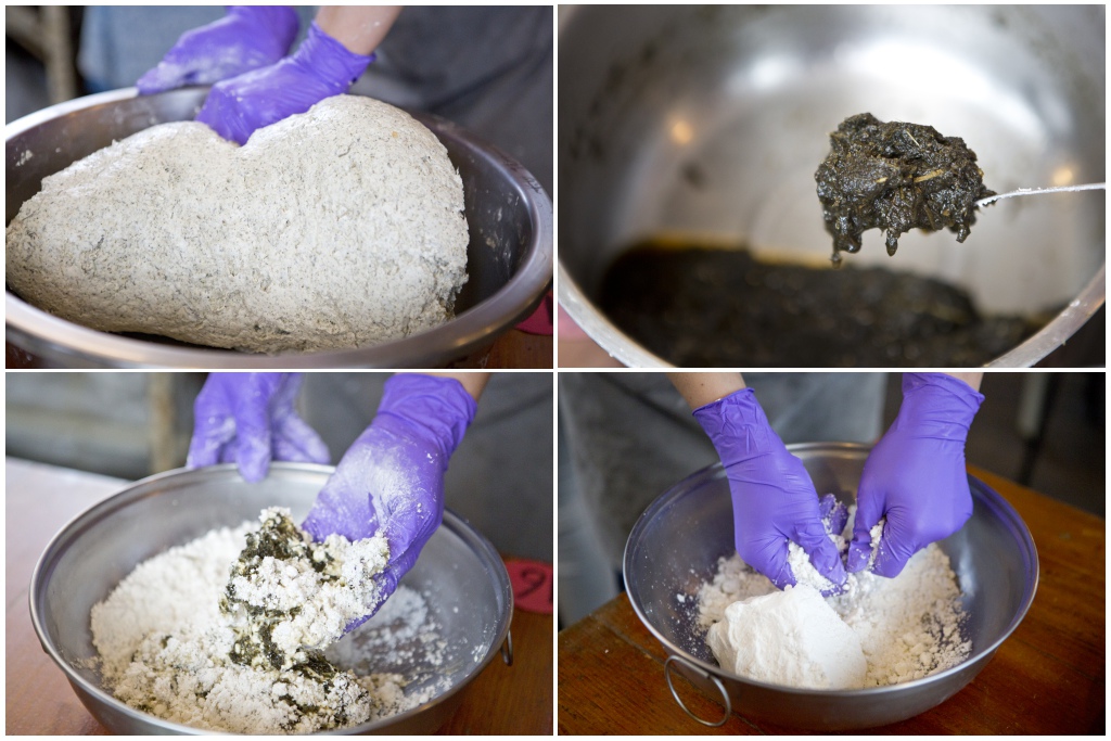 搗碎後的鼠麴草原汁,加入糯米糰內均勻攪拌。