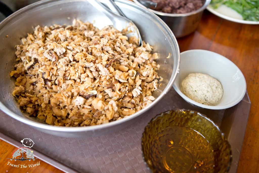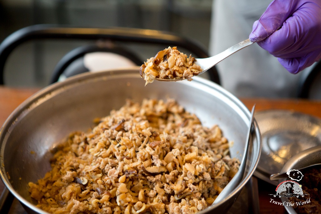 戴上手套,包餡料。