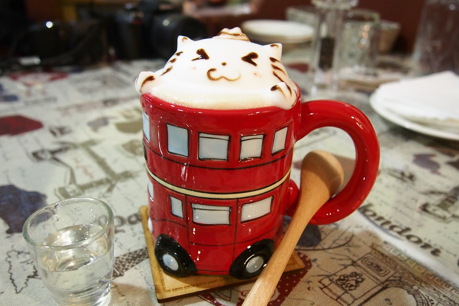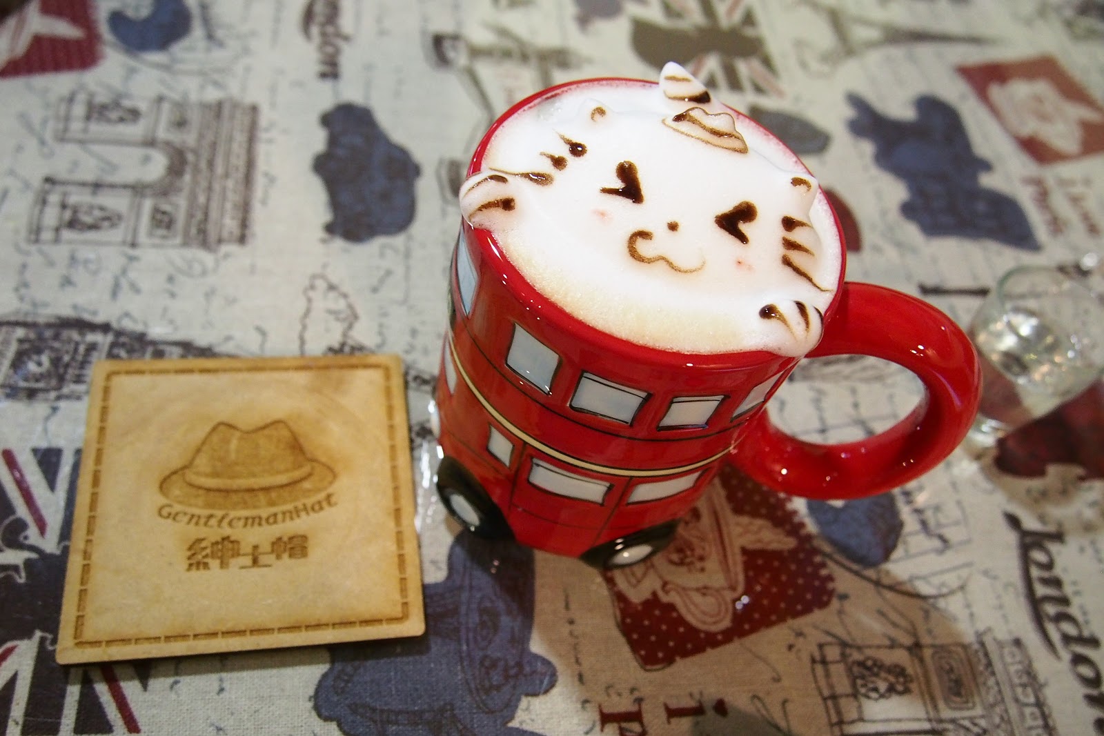 新竹|英式餐廳。紳士帽外觀是可愛的紅色巴士造型一開門就有巨大的國王娃娃在門邊迎接客人牆上掛有很多造型的可愛帽子是可以戴起來拍照的喔連燈罩都是帽子的照型橄欖油辣味海鮮義大利麵229元西班牙海鮮燉飯289元(加起司30元)凱薩沙拉凱薩沙拉手工披薩259元紳士帽奶茶150元非常可愛的立體貓咪拉花還有戴帽子呢!紅色巴士的馬克杯也好可愛去新竹找朋友時,在附近意外的發現這間食物好吃、很有特色的好店打卡可以扣掉10%服務費喔