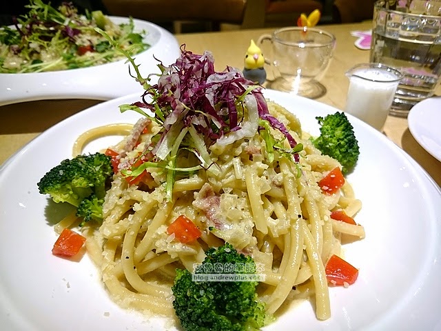 吸管麵(Bucatini) 是義大利麵種類裡比較會吸湯汁的,所以如果湯汁太濃郁會吃起來太膩,而這一道料理的湯汁是用培根加洋蔥和蛋汁去烹煮的,本身醬汁就清甜,搭上番茄丁和有調味的花椰菜,吃起來味道剛好~