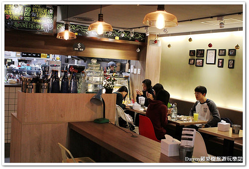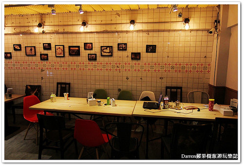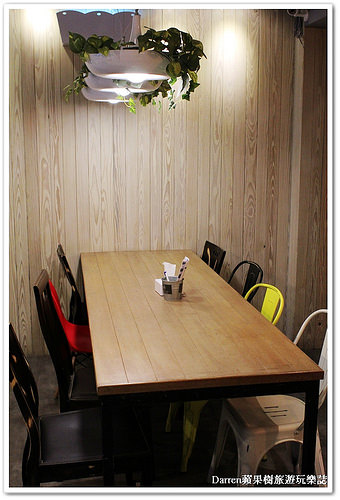 店內的裝潢風格有點工業與簡約風格混搭,運用不同顏色的椅子讓室內空間多了跳色的元素