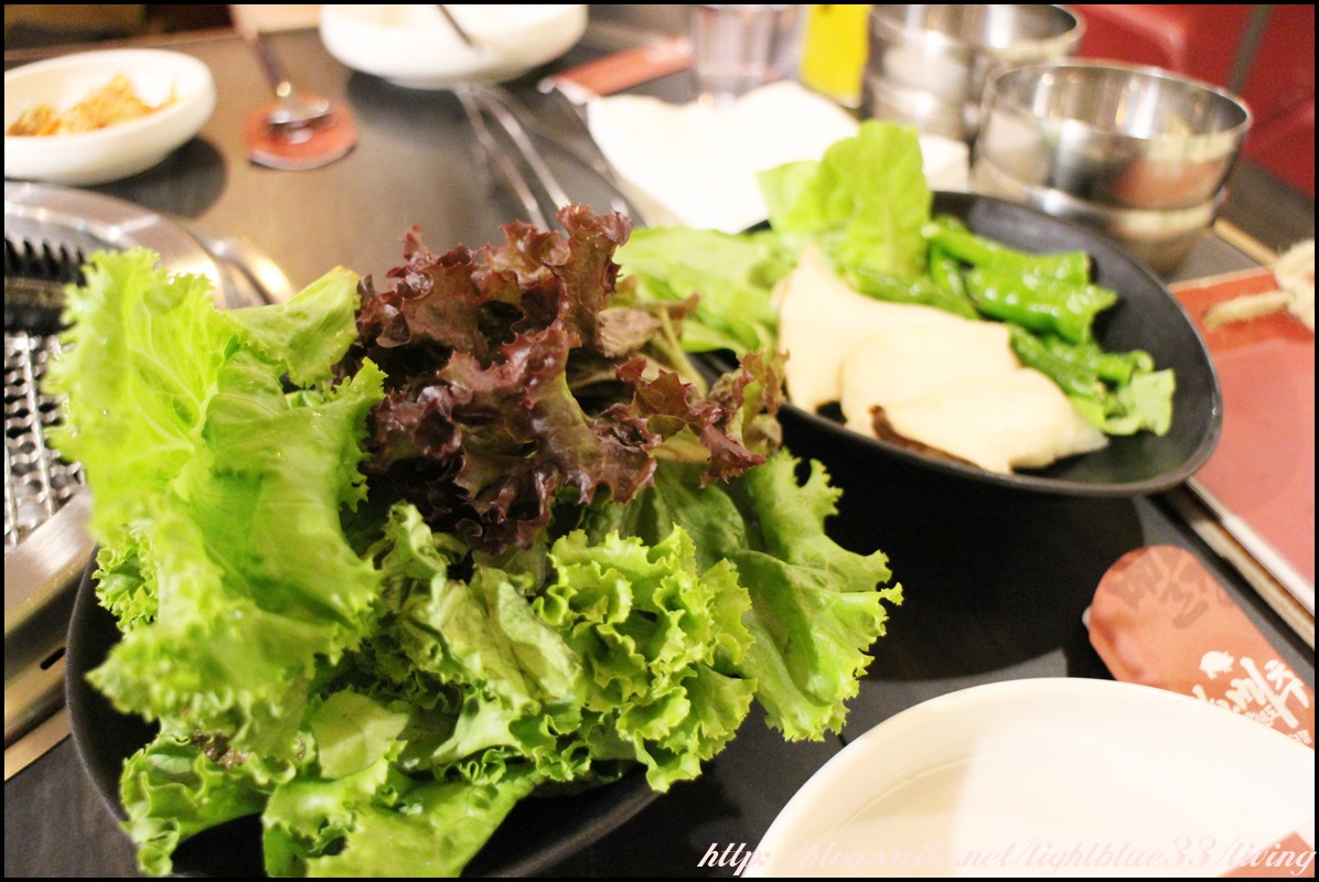 烤肉沾醬後跟著泡菜一起用生菜包起來,我最喜歡這樣吃了