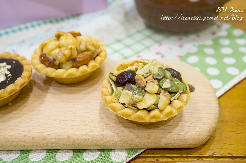 內容有:堅果夏威夷豆塔、養生堅果豆塔、腰果豆塔、杏仁巧克力塔。