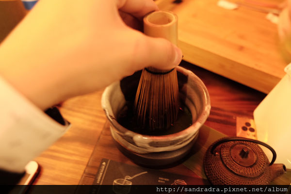 首先將ㄧ小壺熱茶倒入抹茶粉攪拌至無顆粒。