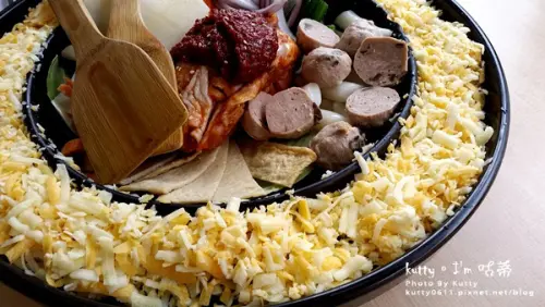 你們看看周圍的那一圈雙色起司,多到都快爆出鍋外了