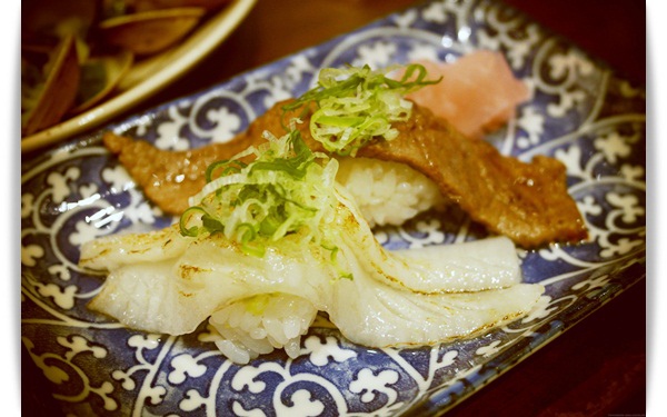 "炙燒比目魚緣側+炙燒牛肉握壽司"