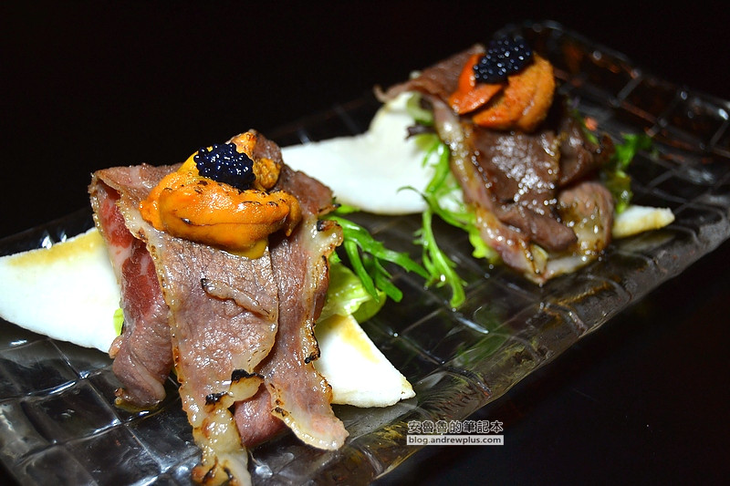 咬下一口,海陸美味在嘴裡混合,冷熱交集的口感,可以吃到鱈魚豆腐的綿滑細嫩,炙燒牛肉片的甜美肉汁和香氣,再來就是海膽的鮮甜,以及魚子醬淡淡的鹹香,味道相當的多層次,如果鱈魚豆腐能夠外皮在煎的焦香呈薄脆皮狀況,那這道料理可真是超完美的!