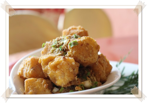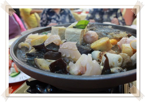 恩~很不錯吃,裡面的配料很豐富,海鮮也好吃又新鮮,配上魚頭煮出來的湯頭一整個美味鮮甜,冬天吃應該蠻適合的。 下一道是金沙拌酥皮客家粿