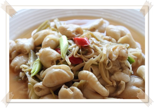 才剛吃幾分鐘又來了一道醋溜薑絲大腸,一聽名子就很期待了,沒想到!!!!