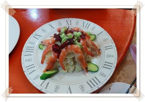 先說說梅干扣肉,真的很有外婆的味道,一樣香甜軟嫩,肥肉跟瘦肉拌在一起吃再扒上大口大口的飯,小時候的回憶慢慢湧現出來,我已經把這道菜當成外婆的愛了,再來是和風蝦,恩...蝦子鮮甜沒有腥味,肯定是新鮮的海鮮才有這味道,好吃阿!!下面的沙拉菜呢~應該比較適合女生吃吧,我才不愛吃菜咧~
