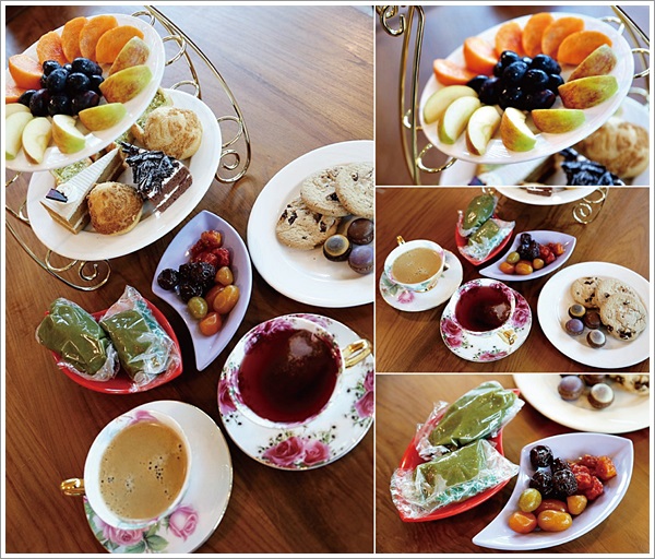 | 這兩人份的下午茶一整個就給它超豐富的!!!… 最上層的水果還有我很愛的柿子… 蛋糕則是下午茶的基本配備… 比較特別的是還有草仔粿跟各式乾果… 真的是光看就覺得超滿足… |