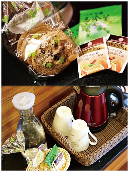 | 客廳提供的茶包還是大禹嶺和相當知名的唐寧茶… 一旁還有提供一包不小包的手工餅乾… 愛吃餅乾的我一眼就看的出來這包一定非好吃… 果然拿出一片咬了一口後我一會兒就把它們全吃完了… 完全沒有辦法等到晚上看電視時再來享用XDD… |