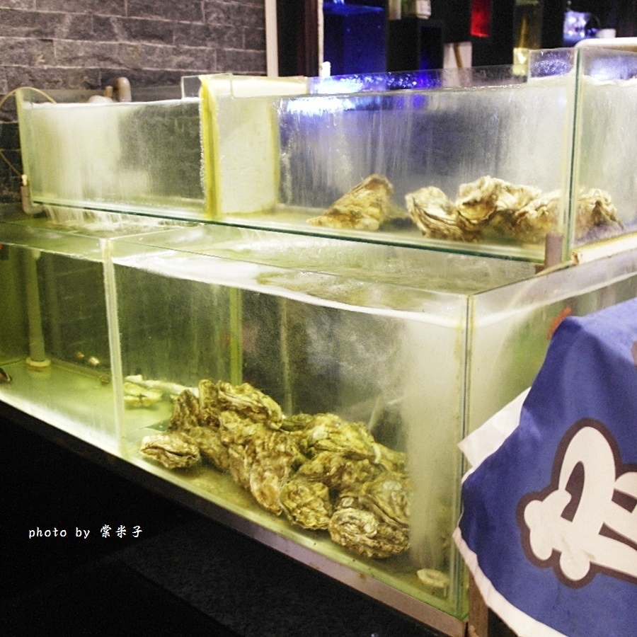 一旁的玻璃櫃內可見新鮮的大生蠔,