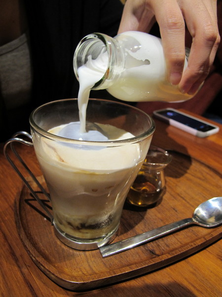 純白的溫鮮奶因為咖啡磚的融化,咖啡色慢慢漆上。