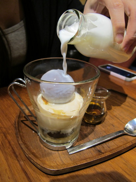 緩緩將溫鮮奶倒入冰咖啡球中,讓兩者結合在一塊。