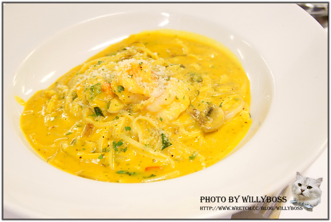 Alice的奶油風味南瓜泥鮮蝦義大利麵套餐價380元,奶油南瓜聞起來非常香,吃起來則是散發出南瓜自然香甜的清爽口味,鮮蝦竟然有先剝殼讓人感覺到貼心,吃來更是脆甜彈牙,可惜份量不多,蝦大概也只有三尾XD。