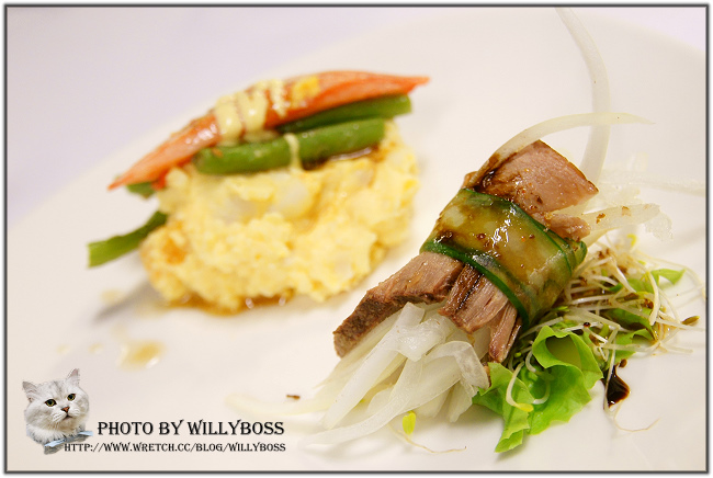 點套餐的話價錢會比單點多80元,但會多出前菜、麵包、湯品、甜點、飲料等等,可以說是相當划算,不點不快XD,這天的前菜一個人有兩種,其一是用牛肉捲洋蔥,加上有點類似油醋醬,冰冰涼涼頗爽口的。