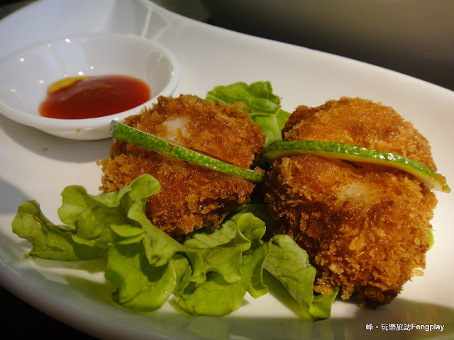 ▲套餐都有招待一份特別的點心,這是金錢蝦,炸的外皮酥脆加上檸檬片,可減少膩口感。