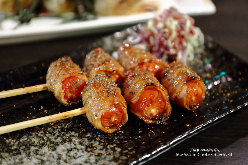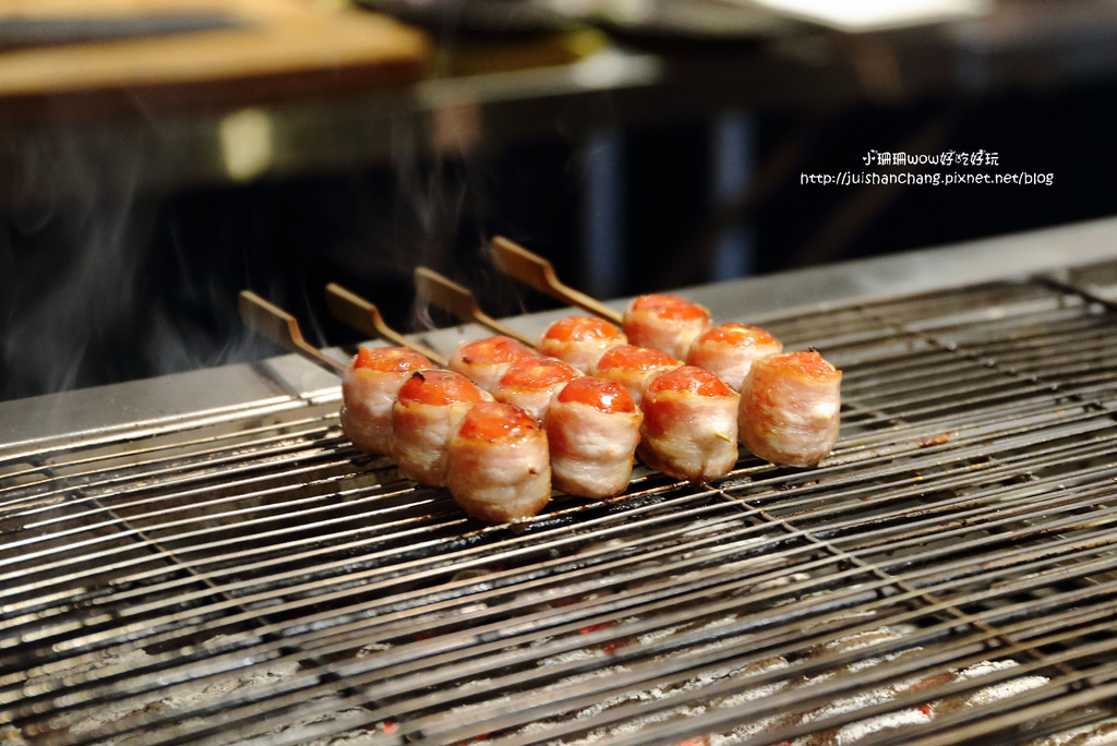 培根包覆著豐富多汁的番茄,經過炭烤後釋放出豐富的茄紅素,微酸微甜的口感,一口咬下香味四溢,有說不出的滿足感,吃一串絕對無法滿足!