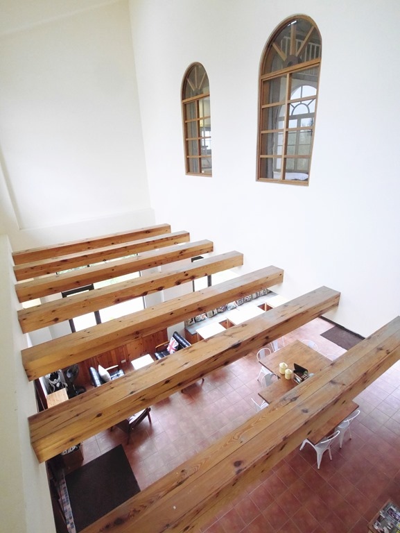 站在二樓俯看,還可看見由原木架構的建築橫樑