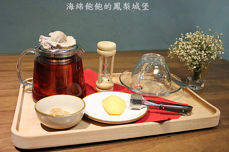 以木盤裝著茶壺、茶杯、甜點與沙漏